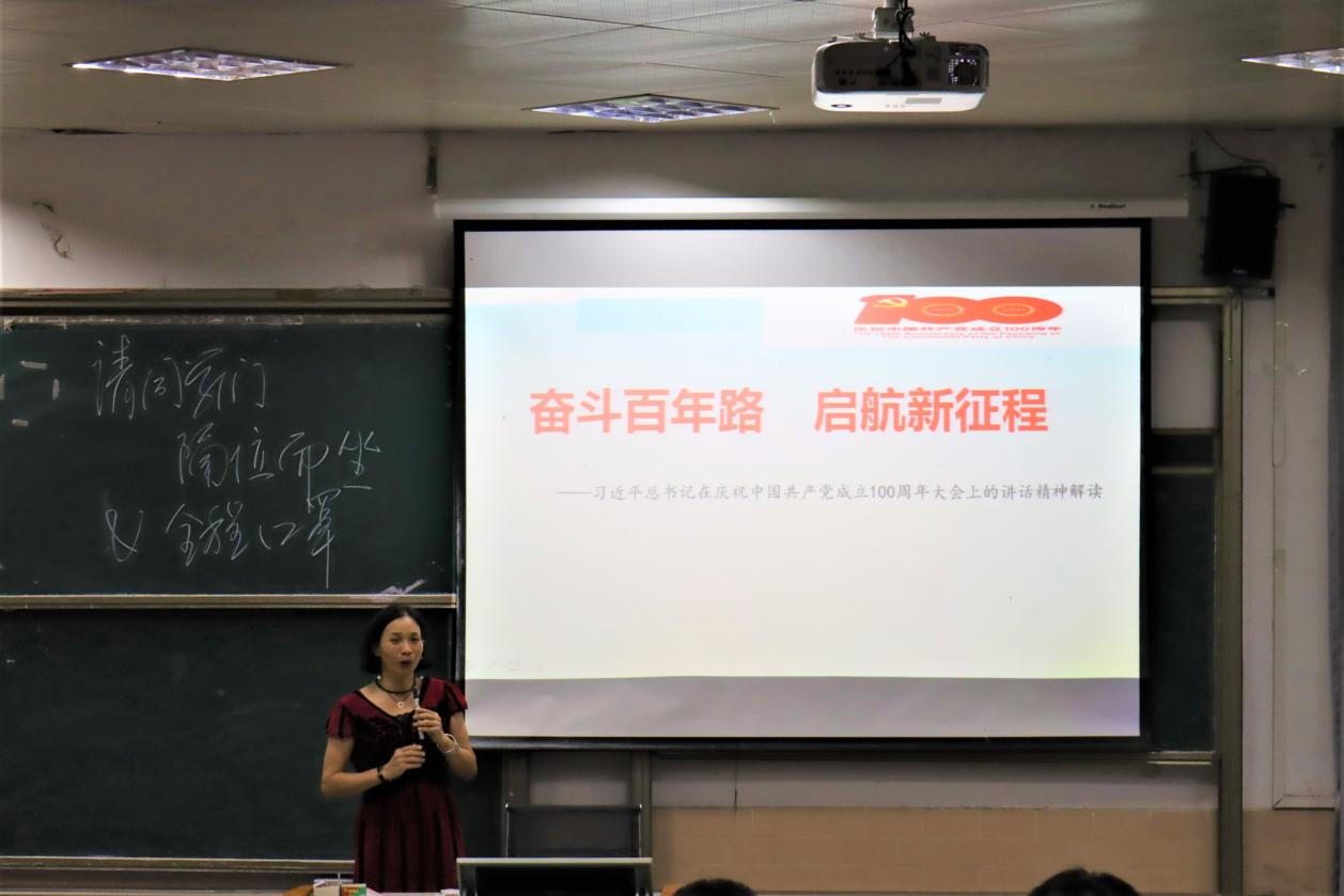 为深入学习贯彻习近平总书记在庆祝中国共产党成立100周年大会上的重要讲话精神,2021年9月10日,太阳集团tyc33455直属党支部书记宋美娴围绕主题“奋斗百年路 启航新征程”,为20级员工上了新学期第一堂思政课。