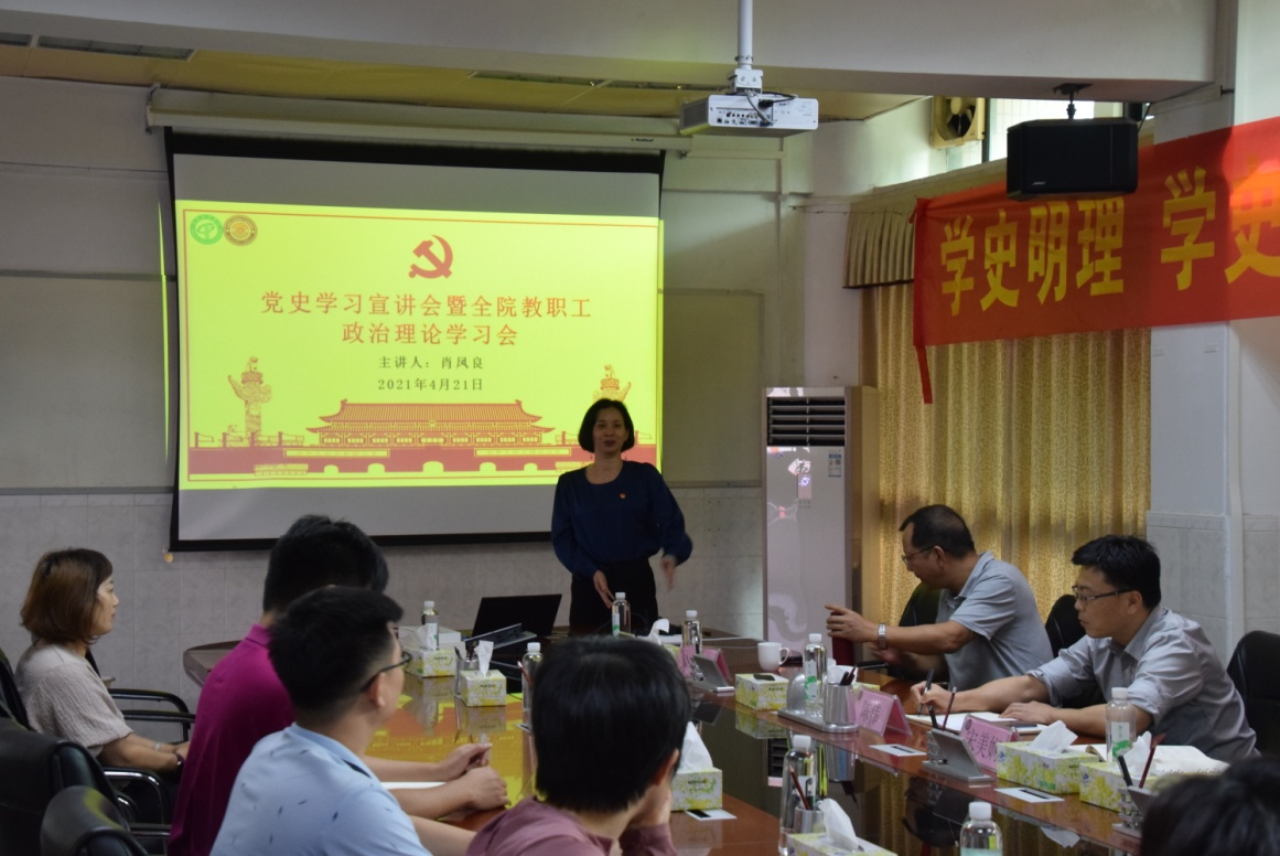 为深入学习贯彻习近平总书记在党史学习教育动员大会上的重要讲话精神,扎实推进党史学习教育,根据公司党委党史学习教育领导小组印发的《关于组织开展党史专题宣讲工作的通知》(莞工学组发〔2021〕1号),4月21日,太阳集团tyc33455直属党支部在学院302会议室召开了党史学习宣讲会暨教职工政治理论学习会。会议由直属党支部书记宋美娴主持,学校马克思主义学院肖凤良教授作专题宣讲,学院教职工参加了会议。