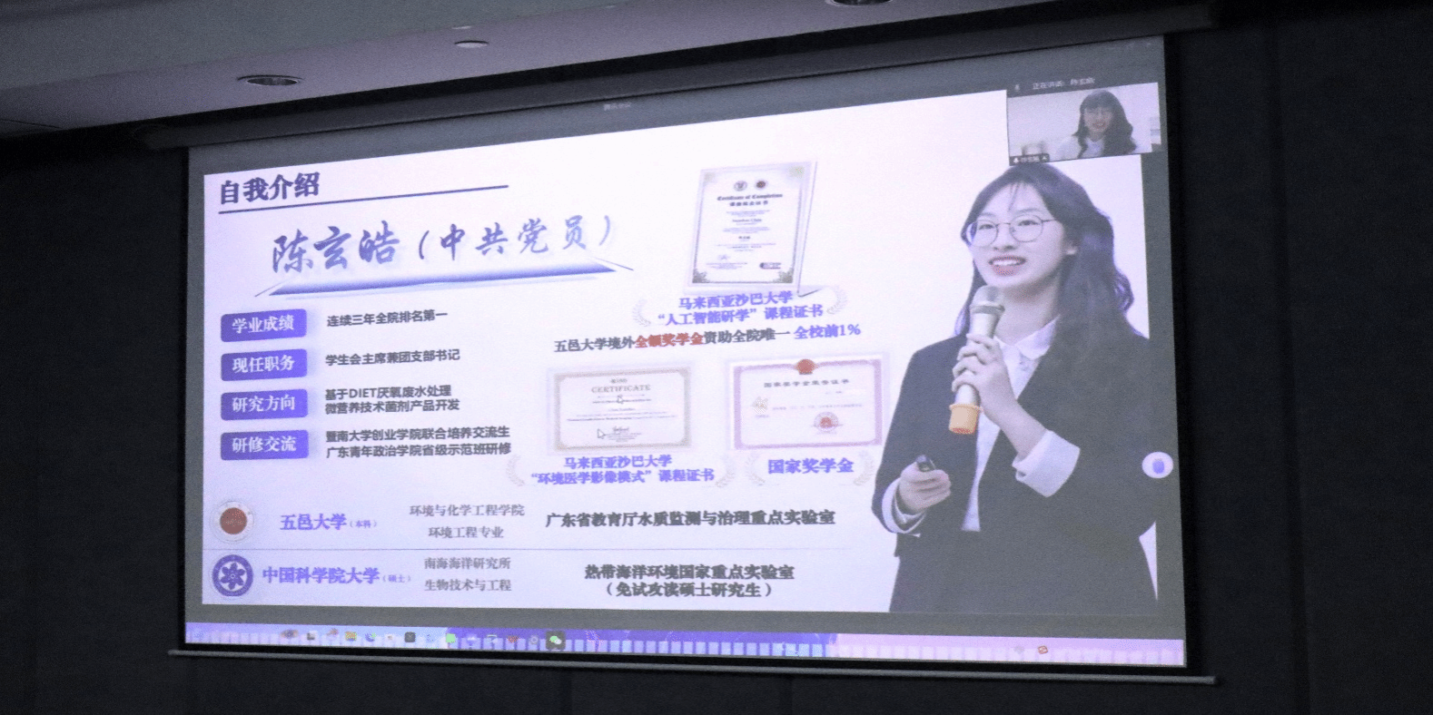 接着,由学院邀请到的中国科学院大学研究生陈玄皓作为首届全国老员工职业规划大赛的国赛选手,以自身参赛经历为例,分享了自己在准备比赛过程中的逻辑梳理、ppt结构、路演准备等内容。同时,她还寄语师弟师妹们要明晰职业方向,积极准备,开启职业规划的探索之旅。