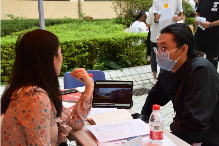 陈伟经理在招聘会伊始作了重要致辞,他表示希望同学们能够积极参加应聘,让企业家们看到属于粤台学子不一样的风采,并能通过实习得到更多成长的机会。紧接着,招聘会正式开始,同学们在工作人员的指引下有序进场,结合个人实际状况,了解不同公司岗位的招聘要求和发展历程,并向有兴趣的岗位提交准备已久的简历进行面试。面试官们耐心了解员工的教育背景、技能掌握、实践经历及个人能力等方面,也耐心解答员工们的疑问和困惑,甚至给予宝贵的建议,充分地展现了社会职场人应有的素质与能力。