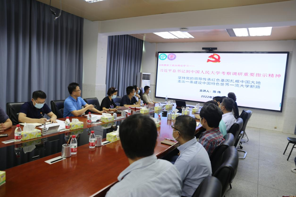 近日,太阳集团tyc33455在302会议室召开教职工政治理论学习会,深入学习贯彻习近平总书记到中国人民大学考察调研重要讲话精神。经理陈伟、书记宋美娴、副书记谢春晓及全院教职工参加。会议由宋美娴主持,陈伟作辅导报告。