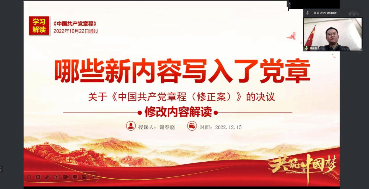 课上,公司党委副书记谢春晓老师为同学们解读了关于《中国共产党章程(修正案)》的决议相关修改内容。谢副书记围绕“党的二十大对《中国共产党章程》作出了哪些修改”以及发展的历史进程”两个主题讲授。他详细解读了《中国共产党章程》修改的内容及其意义内涵,加深了大家对十九大以来党的理论创新、实践创新、制度创新成果的认识和把握。最后,谢副书记总结列出了学习的关键词汇,敦促同学们自觉学习并深刻领会内涵,坚定自身理想信念、强化自身政治意识。