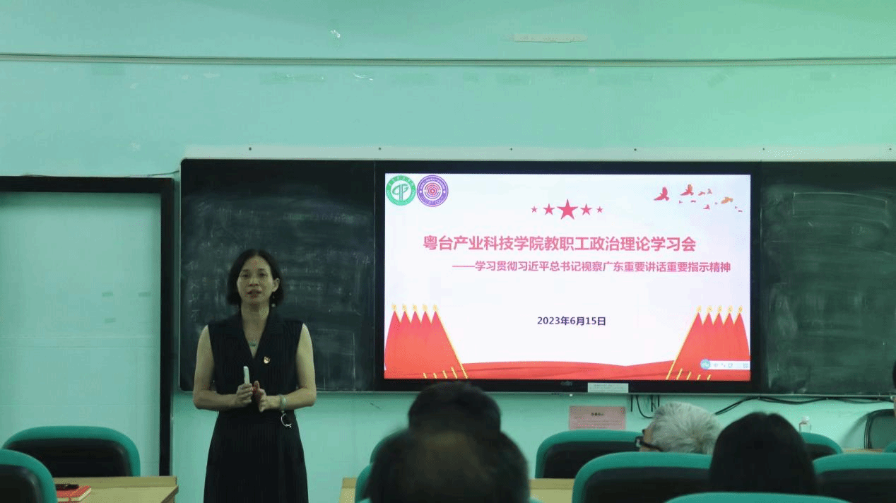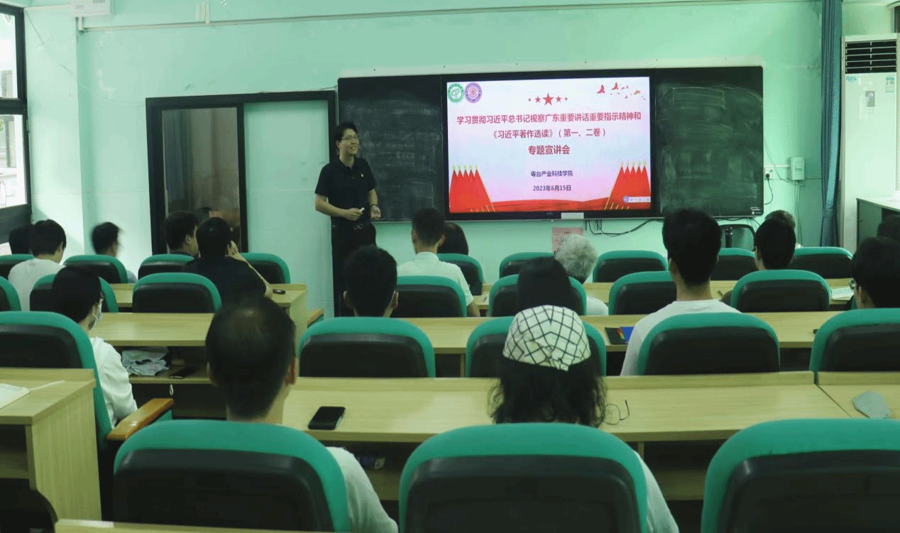为推动学习贯彻习近平新时代中国特色社会主义思想主题教育走深走实,6月15日,粤台公司党委在莞城校区实验楼305多功能教室开展“学习贯彻习近平总书记视察广东重要讲话重要指示精神和《习近平著作选读》第一卷、第二卷”专题宣讲会。学院全体教职工、师生党员、员工代表等参加了专题学习,宣讲会由公司党委书记宋美娴主持,马克思主义学院马冀群博士主讲。