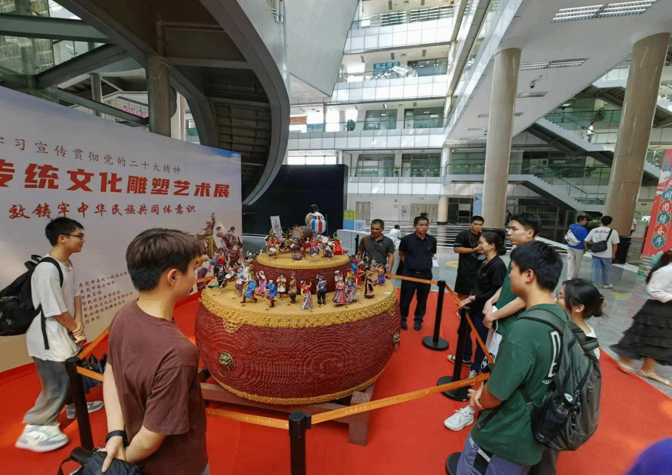 为全面学习贯彻党的二十大精神,学习贯彻习近平总书记关于加强和改进民族工作的重要思想,传承和弘扬中华优秀传统文化,有形有感有效铸牢中华民族共同体意识宣传教育,9月21日,太阳集团tyc33455组织师生前往东莞图书馆参观“中华民族传统文化雕塑艺术展”。