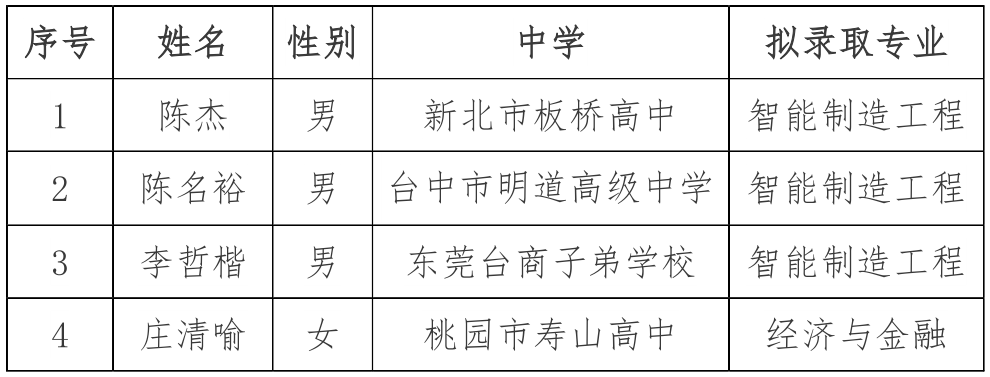 根据教育部有关文件和《太阳集团tyc334552020年依据台湾地区大学入学考试学科能力测试成绩招收台湾地区高中毕业生招生简章》等文件精神,经过报名审核、评委面试,现将拟录取名单和拟录取专业予以公示,公示期为2020年6月8日- 6月26日。对成绩有疑问者,请于公示期内提出,过期不再受理。