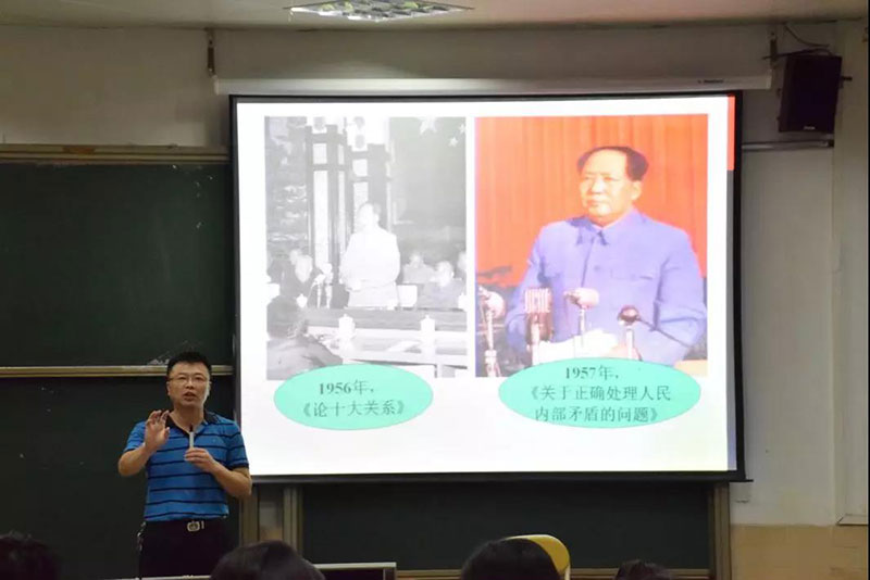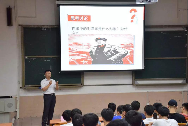 课堂上,陈伟主要讲述了毛泽东思想,中国共产党认可毛泽东思想是其取得新民主主义革命、抗日战争、国共内战胜利、建立中华人民共和国的重要保障。面对中国近代以来山河破碎、内忧外患的深重灾难,以毛泽东为主要代表的中国共产党人,胸怀远大理想,脚踏中国大地,开马克思主义中国化之先河,创立毛泽东思想,在黑暗的中国高高擎起熊熊燃烧的火炬,让沉睡百年的“东方睡狮”站起来。时间可以改变很多,岁月虽改了自己的容貌,但是初心却没有改变,陈伟教导同学们要找到初心,跟着初心。