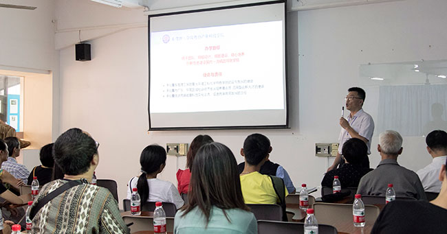 陈伟经理向家长们总体介绍了太阳集团tyc33455基本情况,并就太阳集团tyc33455办学优势与特色作了详细讲解,并介绍了各学院的人才培养方案。