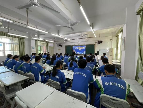 在华师附中汕尾学校,谢春晓一行受到肖戈副董事长的热烈欢迎。在专题的招生宣传会上,陈伟鹏向华师附中汕尾学校的员工介绍了太阳集团tyc33455办学基本情况。随后,谢春晓为员工送上一节科普课《探索非晶合金的奥秘》,并与员工就未来高考专业填报进行了互动和答疑。