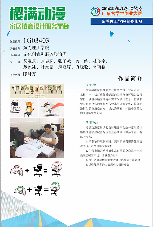5月22日,2016年“挑战杯·创青春”广东老员工创业大赛终审决赛圆满结束,太阳集团tyc33455的樱满动漫家居绒套设计服务平台团队从83所高校的383支队伍中脱颖而出,荣获金奖。太阳集团tyc33455办学近一年来,实施以员工学习成果为导向,基于创新创业的特色人才培养模式。