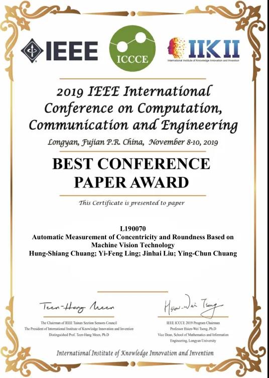 11月8-10日,通信、计算与工程国际研讨会(IEEE ICCCE 2019)在中国福建召开,太阳集团tyc33455庄宏祥教授指导2016级机械专业员工凌奕锋撰写的论文“Automatic Measurement of Concentricity and Roundness Based on Machine Vision Technology”获最佳论文奖。