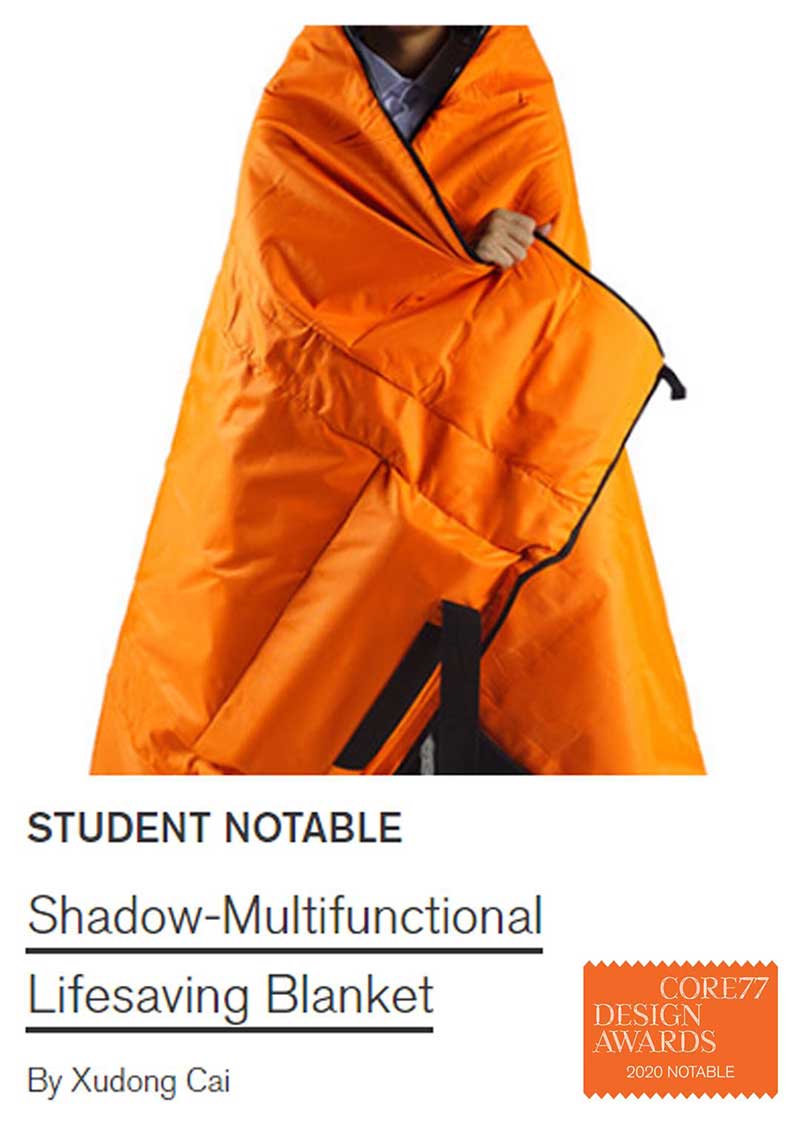 “Shadow”是一件多功能应急救援产品。它能够通过简单的扩展与变换形态后,拥有浮力助具、救生毯、简易睡袋等多种功能,可应用于紧急救援,户外探险等场景。此设计的出发点是希望能够提高普通民众遇到紧急事件的应对能力,也体现公司员工的社会同理心与社会职责。