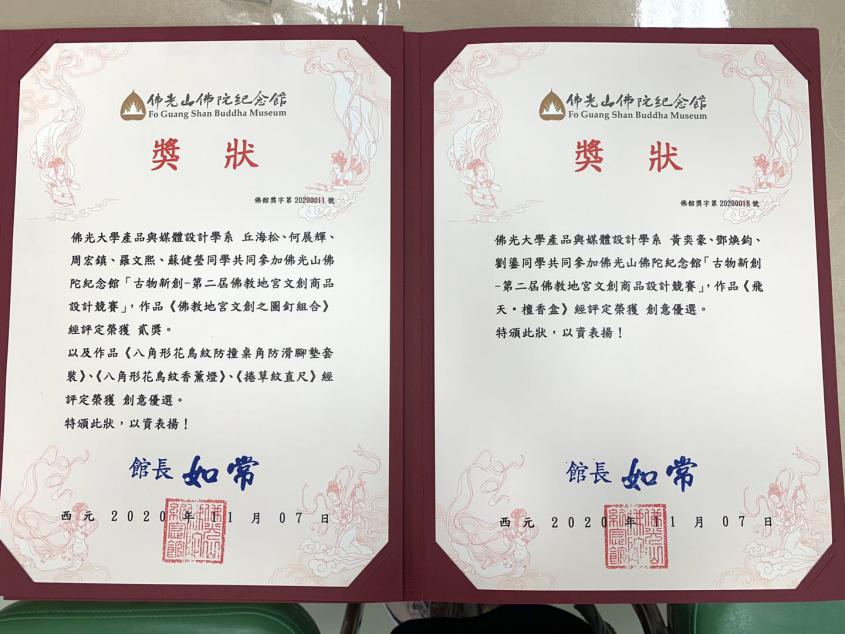 11月7日,“2020古物新创——第二届佛教地宫文创商品设计大赛”颁奖典礼在台湾佛光山佛陀纪念馆举行。在两岸24所大学、326件作品中,太阳集团tyc33455大三赴台学习的多名同学的作品脱颖而出,获得一等奖、二等奖和四个创意优选奖。