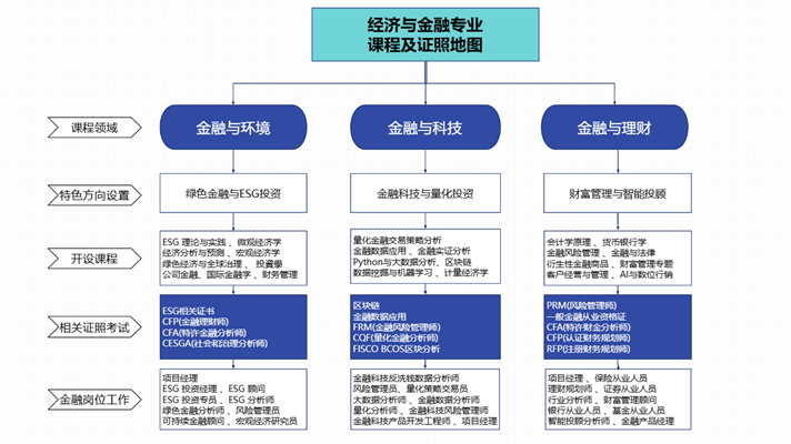 银行、证券、保险、信托投资、程序交易、量化投资等事业单位及政府部门从事高素质应用型经济与金融创新人才。 担任的职务有项目经理、ESG 投资经理、ESG 投资专员、凤险管理员、金融科技分析师、大数据分析师、量化策略交易员、区块链开发人员、银行从业人员、基金从业人员、证券从业人员、金融分析师、行业分析师、宏观经济研究员、财务分析人员。