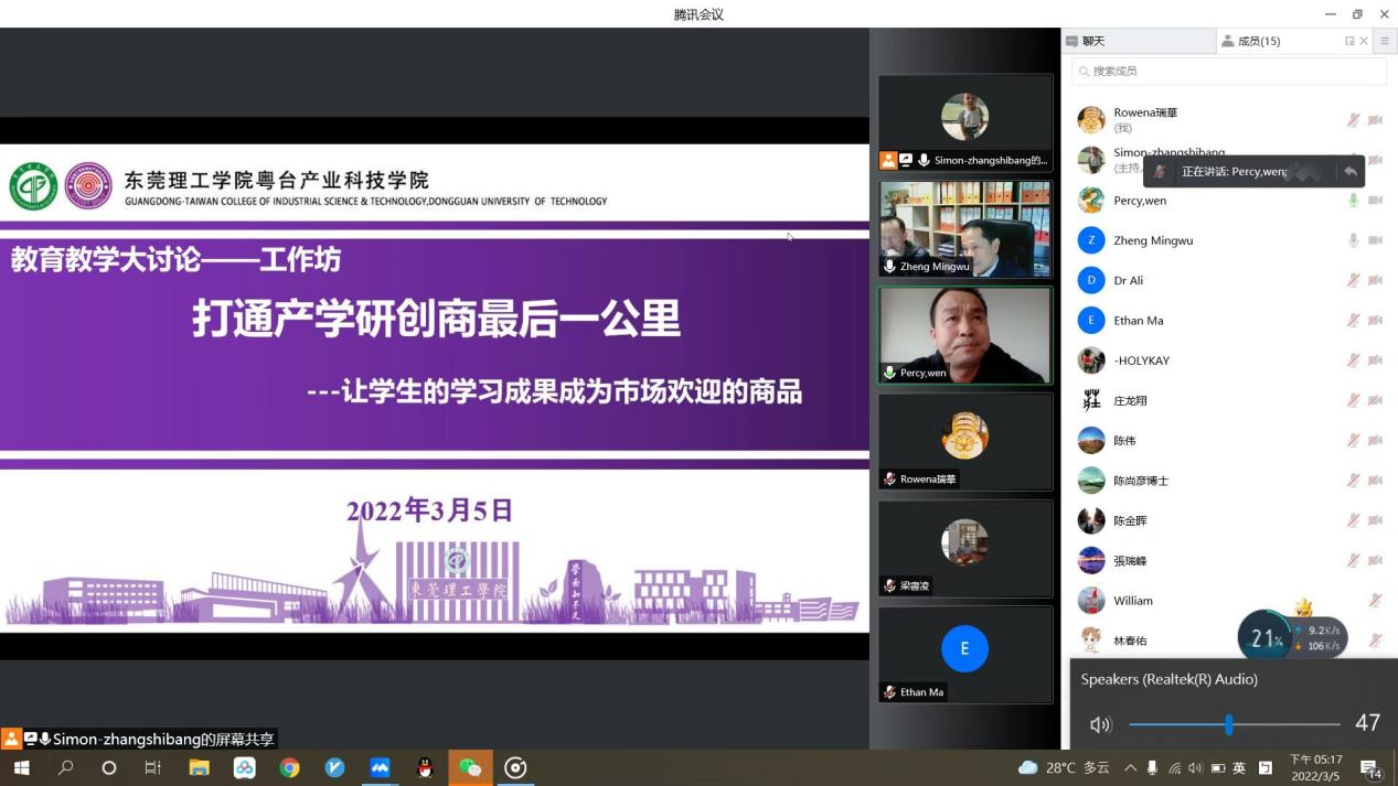 2022年3月5日下午,结合学校公司产品大讨论工作要求,太阳集团tyc33455以线上形式召开“打通产学研商最后一公里--让员工的学习成果成为市场欢迎的商品”国际合作创新工作坊。意大利佛罗伦萨大学恩佐教授团队、大愚科技有限公司总经理陈金晖、瑞思奇电子商务有限公司总经理温观发及学院领导出席。会议由经理陈伟主持。